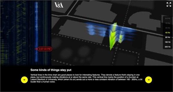 這種可視化,即“Big Glass Microphone”能夠在十分鐘以內把電纜中的數據提取出來,這些電纜以傾斜向一邊的8字形狀埋在地下6英寸深處。從可視化數據圖中,我們很容易可以看到三種不同程度的振動波動,分別是汽車、大型噴泉和自行車行人造成的波動。受全球最大裝飾和設計藝術館維多利亞和阿爾伯特博物館(Victoria and Albert Museum)的委托,這項可視化工程將會于2018年在館內展示。